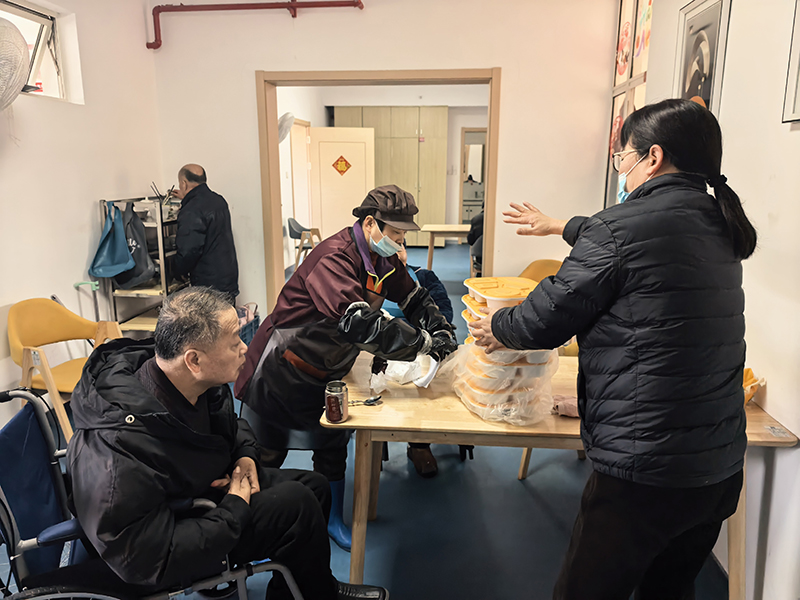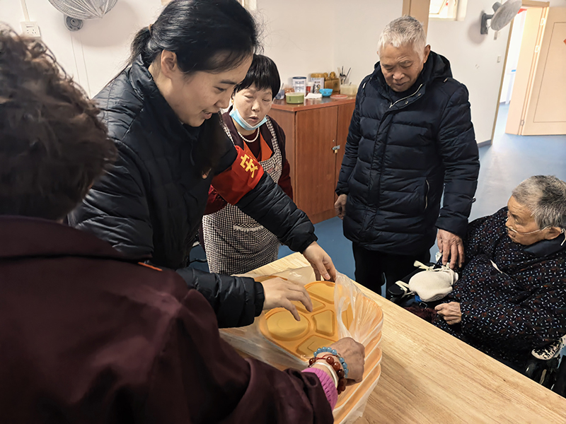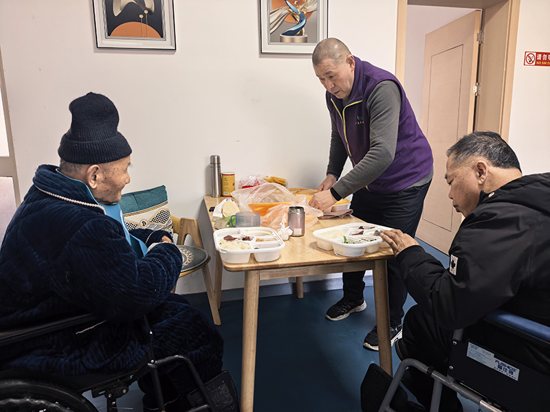 对于行动不便、需要卧床休养的护理老人,护理员们特别安排了送餐到床前的服务。他们小心翼翼地将饭菜送到每位老人面前,还贴心协助进食,确保每一位老人都能享受到这顿充满爱意的年夜饭。