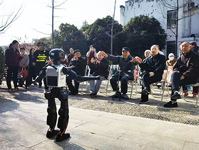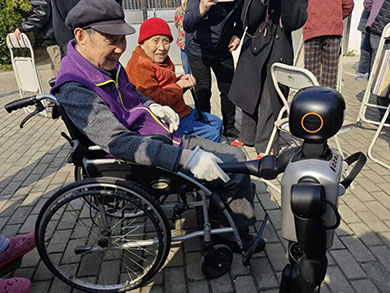 活动现场,小花园里含苞待放的玉兰、星星点点的红李花、破土而出的嫩草芽,处处洋溢着盎然春意。活动在充满新奇与欢笑的“科技初体验”中拉开序幕。智能机器人成为了全场瞩目的焦点,它们不仅能够与长者们进行互动、打招呼,还给长者们带来了精彩的才艺展示。在喜庆洋溢的音乐下,机器人跳起欢快的舞蹈;随着音乐的切换,机器人又表演起刚劲有力的武术招数;最令人惊喜的是,机器人还惟妙惟肖地模拟出传统舞狮的灵动姿态,摇头摆尾,栩栩如生。这些生动有趣的表演赢得长者们的阵阵掌声和欢笑,让大家在零距离互动中深切感受到了人工智能的奇妙魅力与现代科技的温暖。