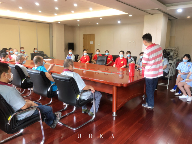为员工们科普火灾的起源。引起火灾的因素有很多,如电插座起火、香烟等火源掉落在易燃物上起火等。为院内员工讲解当火灾发生时自救方法以及灭火器的正确使用,在保护自身的同时,也要更好地保护老人的安全。