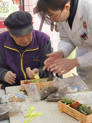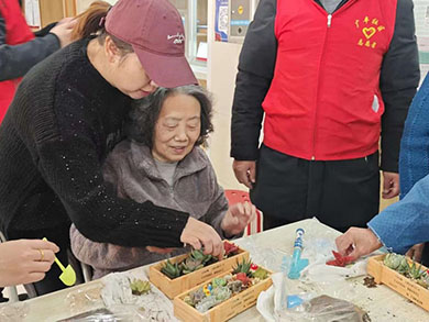 在现代科技展示后,随机而来的是“共植多肉,绿满心田”环节,将活动的温馨与绿意延续。我们特别准备了轻便易用的适老化园艺工具套装,长者们兴致勃勃地挑选自己心仪的多肉品种,在各位志愿者与工作人员的指导、协助下共同完成了填土、栽种、铺面、装饰。大家一边互相交流种植心得,一边欢声笑语不断。不一会儿,一盆盆形态各异、生机勃勃的多肉盆栽便在长者们手中诞生,为他们的生活空间增添了盎然绿意与情趣。肥厚饱满,错落有致的多肉,像一团团凝固的晚霞,承载着最温馨的陪伴,是岁月静好最生动的注脚。